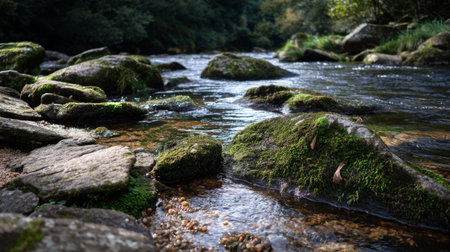 A serene stream flows through a rocky landscape, with moss-covered stones and lush greenery. This nature scene captures the essence of tranquility and beauty.