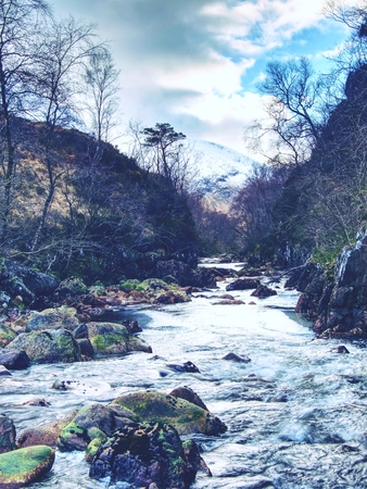 Icelandic landscape with river and mountains in cloudy day. Toned.