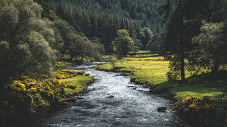 a river flows through the picturesque scottish landscape captured in this photo. with an 8k resolution, the image showcases a serene atmosphere with pastoral settings. the color palette features a combination of dark cyan and light amber, complemented by hints of light pink and amber. this photo is available under the creative commons attribution license. ai generated