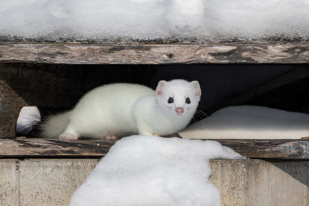 Stoat or short-tailed weasel (Mustela erminea) with head starting to moult and peeking behind the snow in early spring.