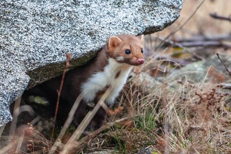 Cute little Least weasel is peaking out from under the house deck in brown grass in the back yard in autumn.