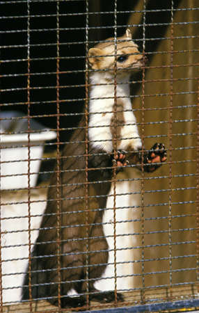 Stoat, Mustela erminea, at a fence.