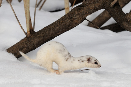 Winter Least Weasel Mustela nivalis running in snowdrift