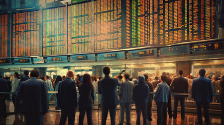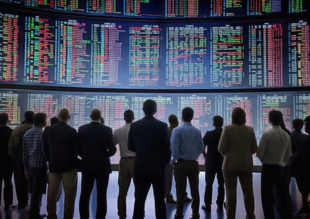 Group of investors observing stock market data in a trading room during trading hours at a financial institution