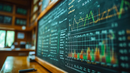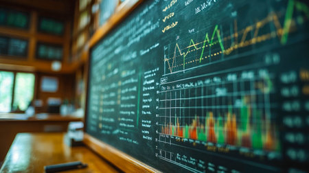 Wooden library interior with a chalkboard displaying global financial data and charts, representing education, business, and investment.