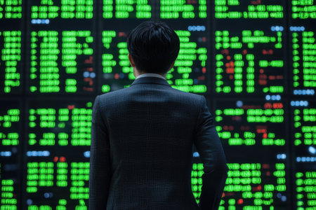 A modern financial office featuring large display screens with stock market trends and analytics, showcasing real-time data in a sleek and contemporary environment.