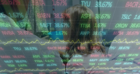 Image of interface with graphs and data with man and woman brainstorming in office. communication technology digital interface concept, digitally generated image.