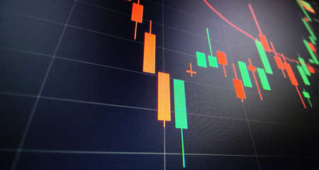 Stock market candlestick chart, asset prices movement, currency exchange price action simple concept. Computer screen, display, candle chart, graph detail, extreme closeup, nobody, no people