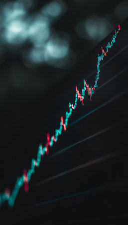 A detailed close-up view of a candlestick chart displaying stock data. The graphic illustrates financial trends with vibrant colors, aiding data analysis.