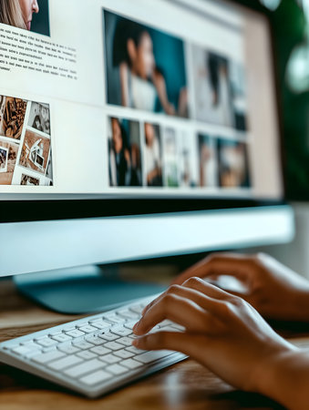 A close-up view of a hand gently selecting images on a digital screen. The background showcases a captivating collage of varied photos, representing modern media interaction.