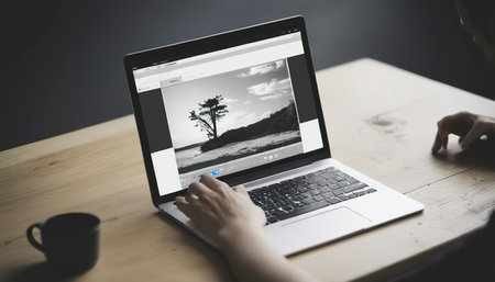 A remote freelance worker, thin laptop with a photo on the screen and a camera in the foreground, AI generative