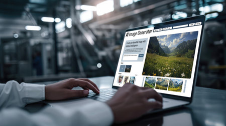 Laptop with a stock photo website open. showcasing a wide range of images. Perfect for illustrating website design. online business. remote work. and digital content creation.