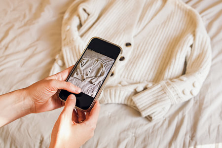 Close-up of woman's hands taking picture of her clothes. Selling used clothes online, reuse, sustainable consumption