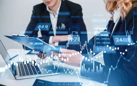 Two businesspeople traders working together to develop new trading strategy. Stock market changes, business candlesticks graph. Concept of internet trading