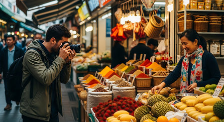 Vietnamese man taking photo of local market in Hanoi, Vietnam