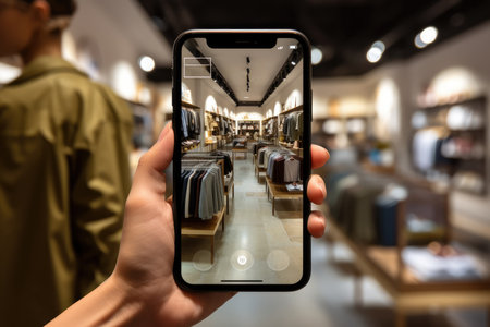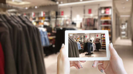 Woman hands taking a tablet in shopping mall with blurred image of clothes shop. The concept of online shopping and augmented reality