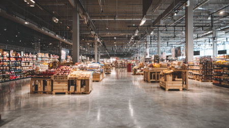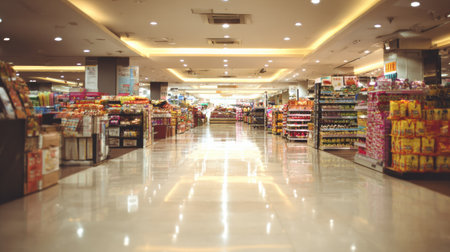 Brightly lit supermarket features wide aisles with neatly arranged displays. Shoppers can explore various products in a welcoming atmosphere.