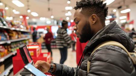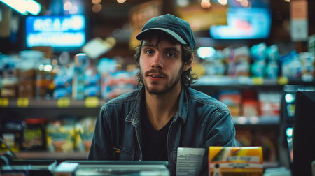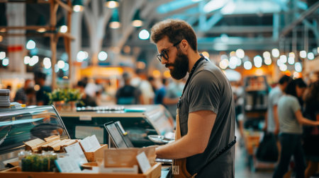 A man working in a bustling food market, surrounded by shelves and customers. The image highlights themes of food market, commerce, and customer service.