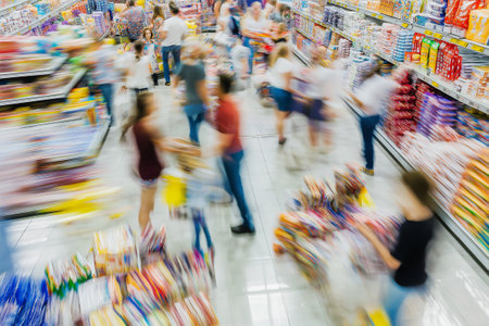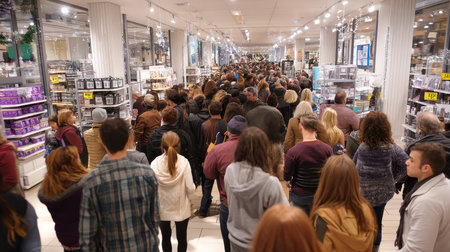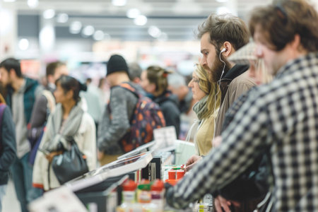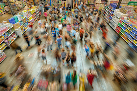 Shoppers waiting in line at a crowded supermarket checkout counter during a big sale event