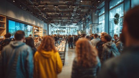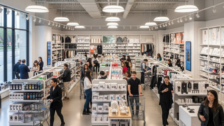 An interior shot captures a modern retail store with numerous shoppers. The scene features rows of shelves filled with products, illuminated by bright overhead lighting. The composition highlights a clean, minimalist style with a focus on product displays. This image could be suitable for commercial use in advertising or editorial content about retail.