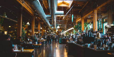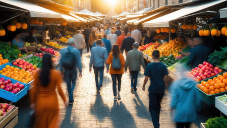 A bustling marketplace showcases a variety of fresh produce, baked goods, and prepared foods. The scene is filled with people browsing and interacting. The composition features a wide perspective, with natural lighting illuminating the diverse array of products. This image is suitable for illustrating themes related to food, commerce, and daily life.