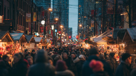 A vibrant night market scene filled with crowds enjoying festive stalls illuminated by glowing lights. The urban backdrop enhances the holiday spirit, creating an enchanting atmosphere.
