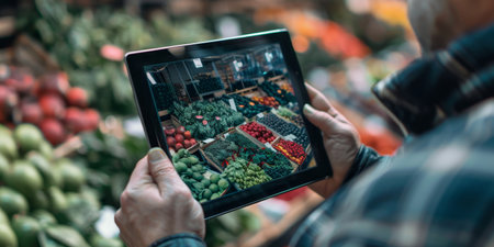 A man is holding a tablet in front of a produce stand