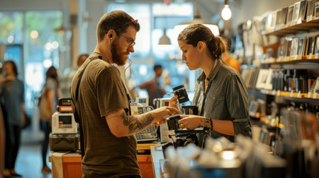 An engaging photograph of staff assisting customers in a camera store, capturing the interaction and expertise involved in the wholesaling environment. --ar 16:9 --v 6 Job ID: c1d56757-19a5-497d-b175-90efaab1944c