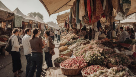 Bustling outdoor market scene with vendors, flowers, shoppers, and awnings, bathed in sunlight