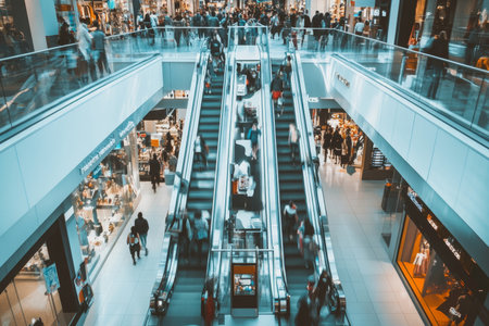 Vibrant shopping mall scene with busy escalators and fashion brands for dynamic promotional content