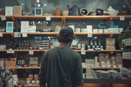 A man is looking at the shelves in a store. The store is filled with various items, including a large selection of books. The man is browsing the shelves