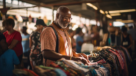 Flea market with stalls and interested buyers