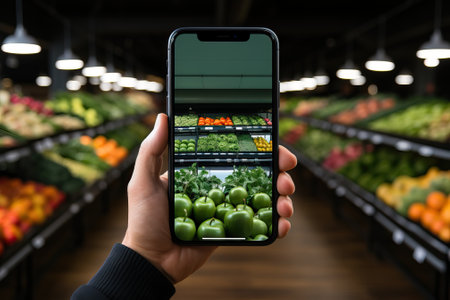 A hand holding a cell phone with a picture of a fruit and vegetable market on it. Concept of abundance and freshness, with a variety of fruits and vegetables on display
