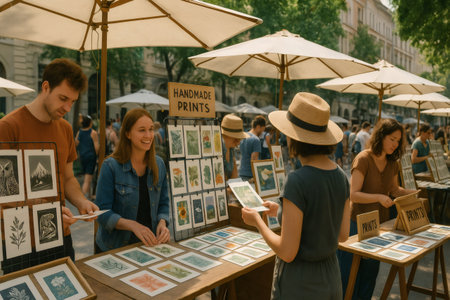 Smiling artists engaging with customers while selling handmade prints at an open air art market on a bright, sunny summer day