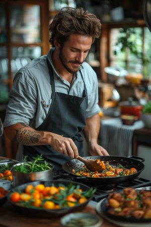Man in blue apron cooks in your kitchen, demonstrating culinary expertise and passion for food.