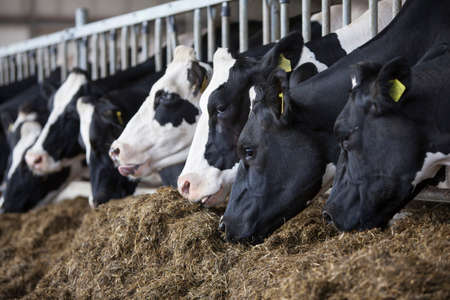 Dairy cows eating hay in the cowshed at a dairy farm, feeding time for the cattle