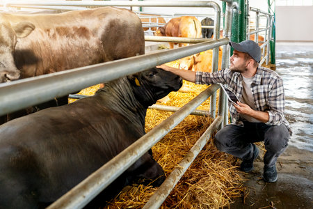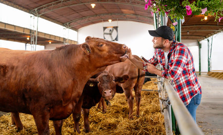 Male farm worker inspecting cows in livestock barn with digital tablet