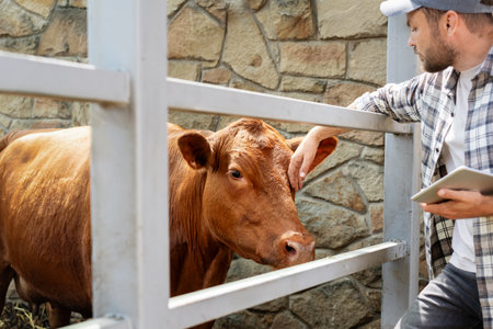 Male farmer with digital tablet visually inspecting a cows on a livestock farm.