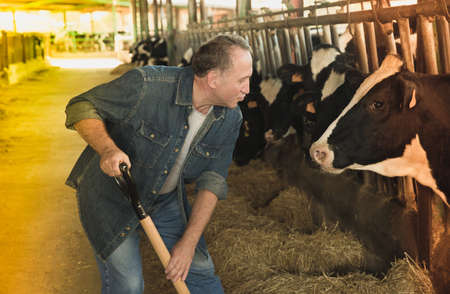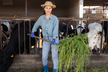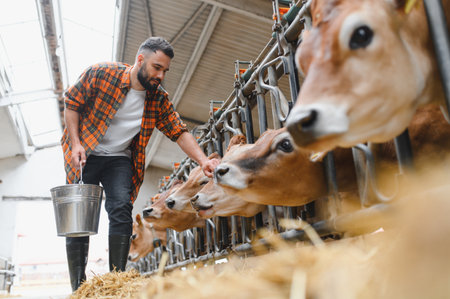 Farmer taking care of his jersey cows, providing them with fresh hay in a modern cowshed, showcasing sustainable livestock management