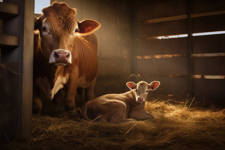 A serene scene featuring a cow and her calf standing together in a rustic barn. The soft natural light highlights their features, creating a warm atmosphere.