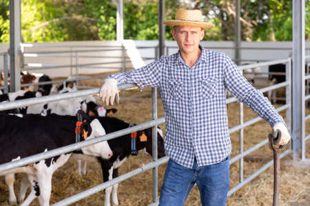 Farmer proudly standing with arms crossed in barn, observing his cows feeding on hay, showcasing livestock management and agricultural practices