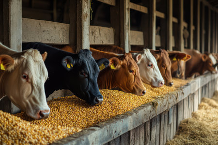 Cattle, corn, and other farm feed displayed in barn, illustrating animal care, rural farming, and livestock management practices.