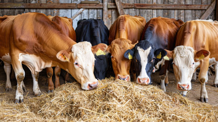 Group of jersey calves feeding on hay inside a barn on a modern dairy farm, representing sustainable agriculture and livestock management