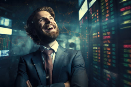 A cheerful, Happy Businessman in a formal suit against the background of stock exchange charts. Trade and finance, the concept of the stock market.