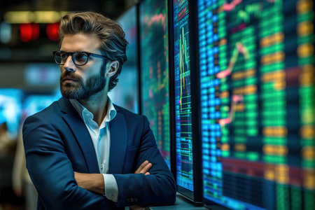 A focused businessman at his desk, analyzing financial data on multiple screens. Perfect for themes of finance, work, and corporate environments.