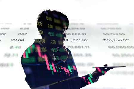 Double Exposure Silhouette of businessman use tablet with stock market pricelist. Concept for business and finactial economy.