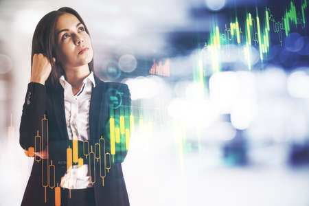 Pensive businesswoman and global business chart hologram on digital screen. Money and trade concept. Double exposure