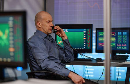 Stock Traiding. Trader sitting at office monitoring market taling on phone doing online trading training laughing cheerful on workplace