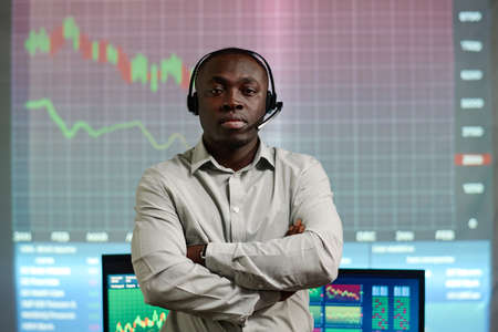 Portrait of self-confident investment specialist wearing headset with mic standing in office with arms crossed looking at camera