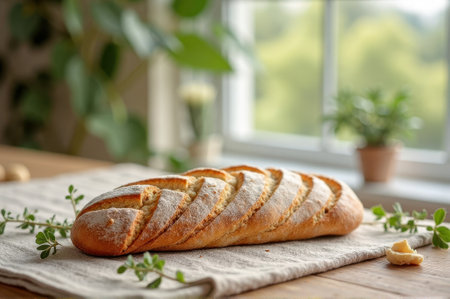Artisan French baguette on rustic kitchen table with fresh herbs and natural light. That the image is generated using AI.